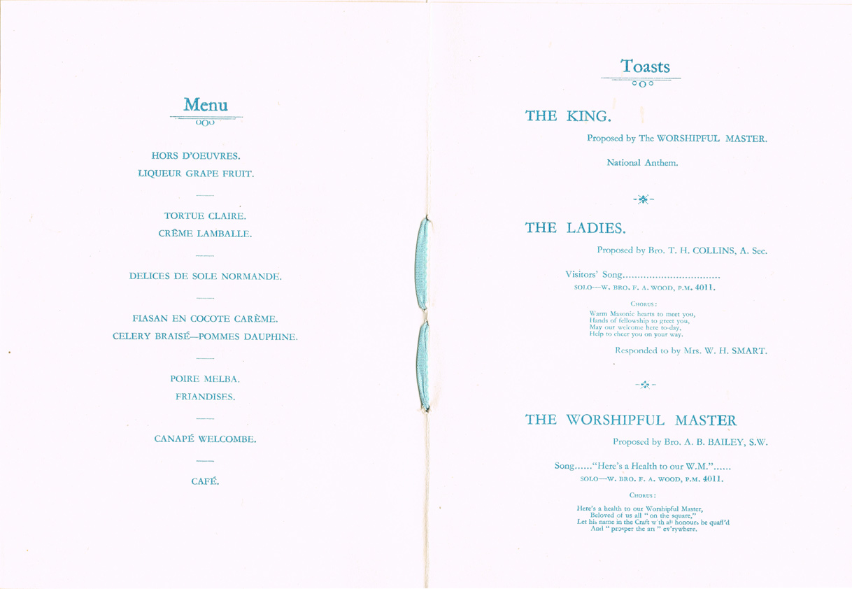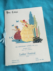 Recently donated to De Montfort Lodge were a collection programmes and menus from events held by Lodge in the mid '30s. Among them were a pair of programmes for a Ladies' Festival held on 8th February 1935; exactly 81 years to-the-day of the 2016 Ladies-to-Dine evening held by De Montfort lodge! Click on the photographs below to see enlarged images.